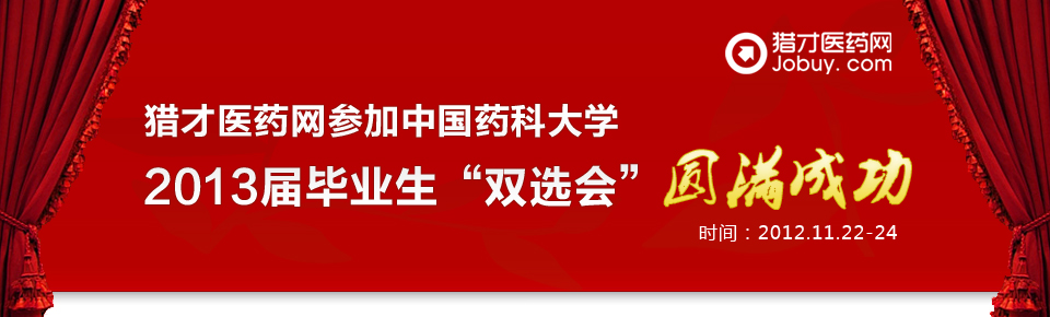 11月22日-24日,中國藥科大學2013年應屆畢業生“雙選會”在南京白宮大酒店舉行,獵才醫藥網參加了此次“雙選會”并滿載而歸。 中國藥科大學是一所歷史悠久,特色鮮明、學風優良、在藥學界享有盛譽的國家“211工程”重點建設的大學。2013年,該校將有1022名研究生,2680名本科生,290名專科生完成學業,走向工作崗位。大量的優質生源吸引了全國各地300多家企業前往招聘。獵才醫藥網對參加此次“雙選會”特別重視,獵才醫藥網作為中國百強制藥企業招聘首選的網絡平臺,期待幫助醫藥行業未來的菁英們提供一個絕佳的職業平臺。 |